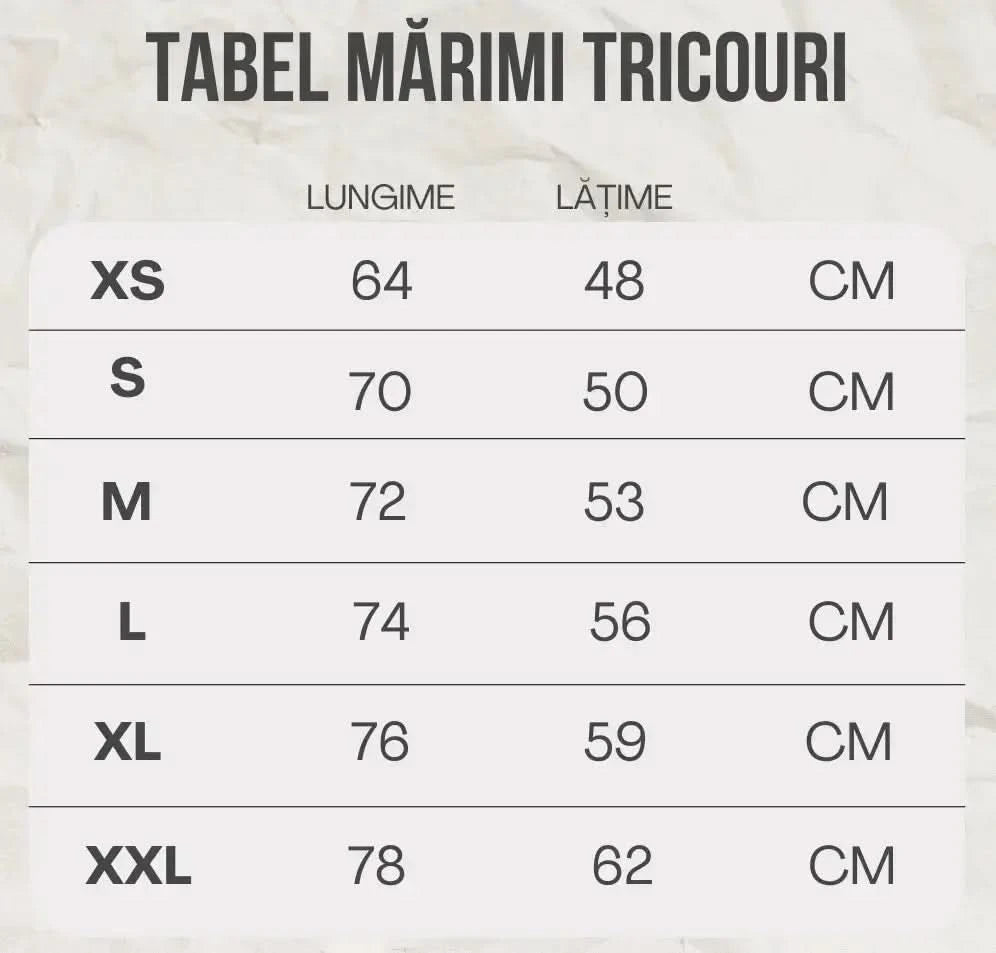 Te rugăm să consulti tabelul de mărimi înainte de a plasa o comandă.